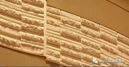 經(jīng)過迎賓長(zhǎng)廊,步入迎賓大廳,6根異型石柱映入眼簾,柱面石材雙曲造型與吊頂竹節(jié)弧形雕刻鋁板相互延伸。柱面石材鋪貼也是采用了亞地斯(ARDEX)的輔材產(chǎn)品。